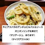 ☆ 今週のパスタ(マリアージュ、あります) ☆ 牛とアスパラのアンチョビ&バジルソース オニオンリングを乗せ…